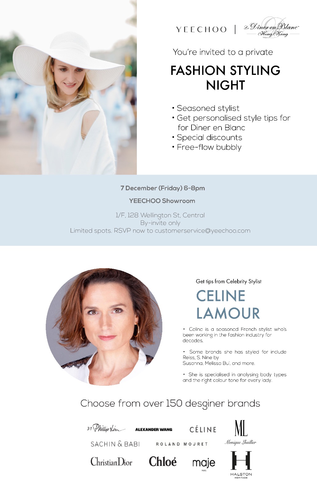 Ladies If you don't know what you wear for Diner en Blanc. Yeechoo, Asia's premier designer dress rental destination is organising a styling event on Friday, 8 December at their showroom in Wellington Street in Central.